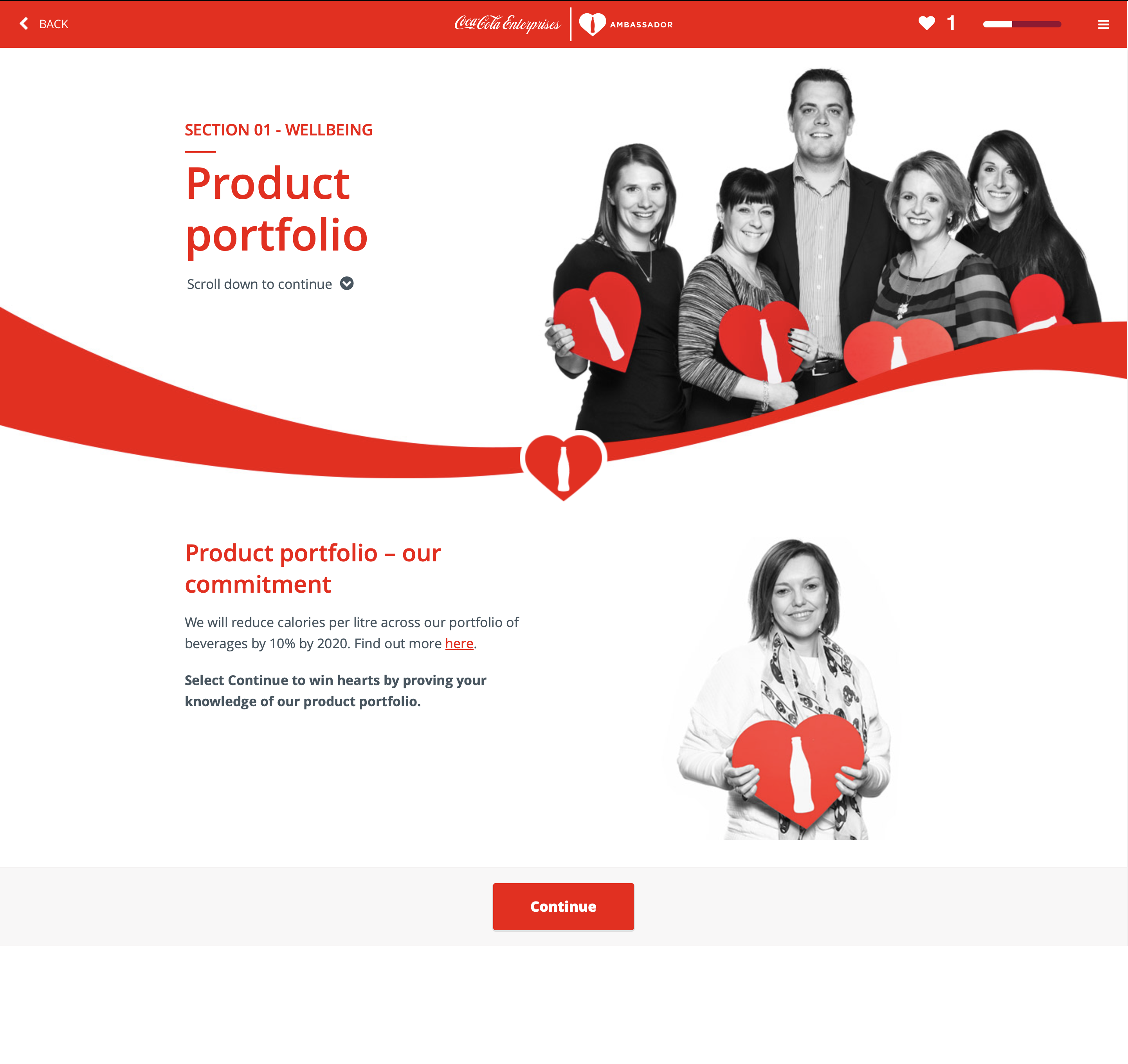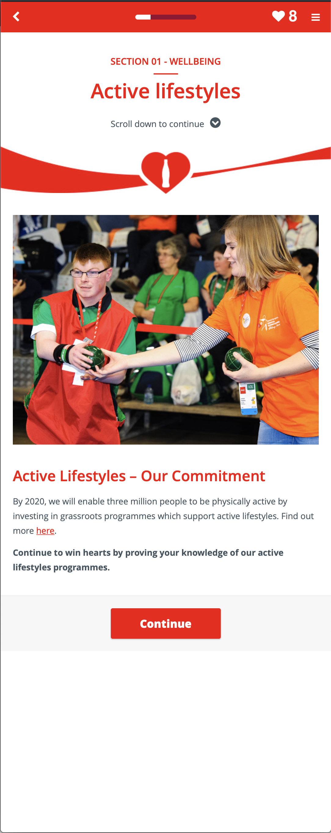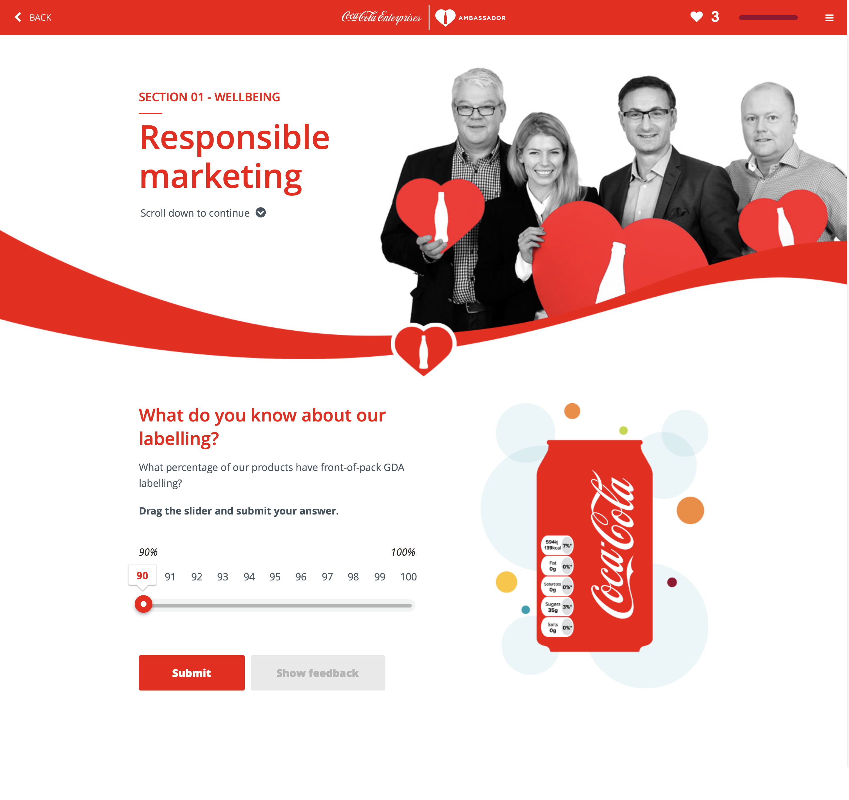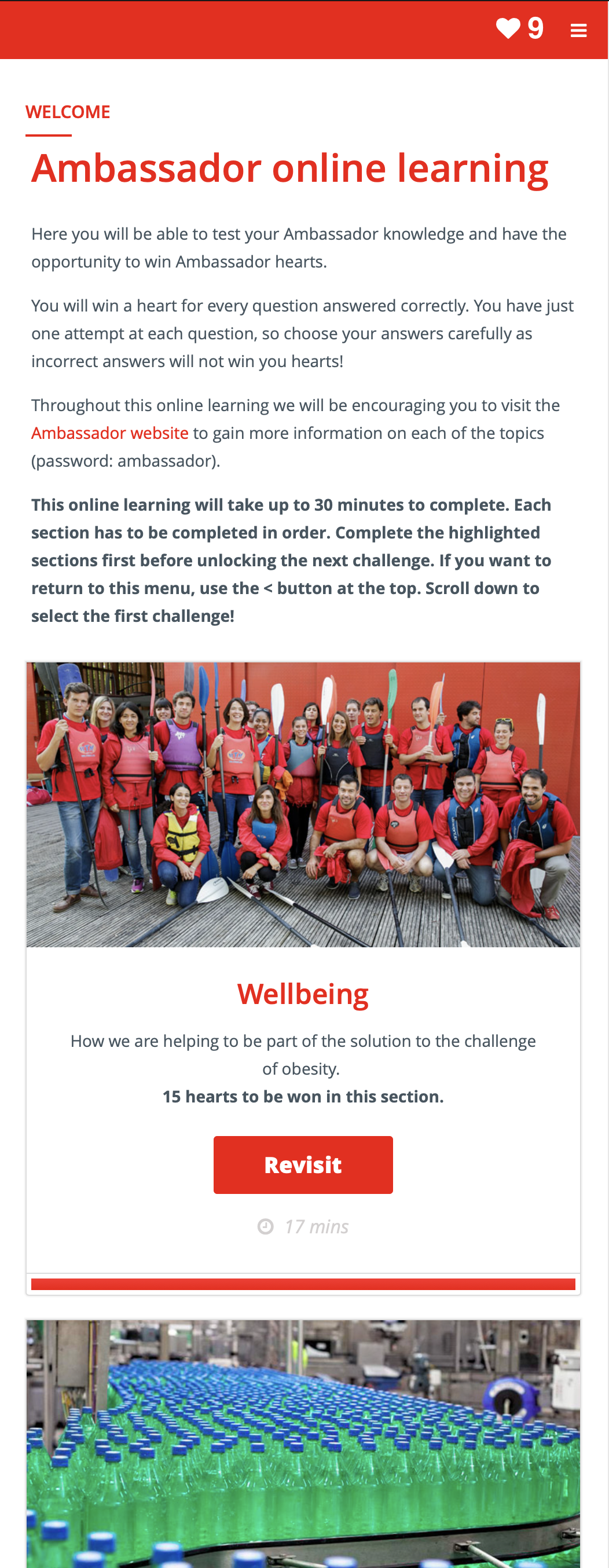 Using gamified learning scenarios to test brand knowledge – a mix of quiz-based techniques bring the facts to life through knowledge checks and scenario-based questions. These were carefully designed to replicate real-life situations that the Ambassadors might face. Combining facts and fun, it empowers and motivates them to learn the product knowledge they need to boost their confidence. Correct answers win hearts, with totals added to a European-wide leaderboard. Importantly, the number of hearts per country was converted into a donation to charity. The whole experience was developed using the Adapt authoring framework, making it easy for mobile workers to take part.