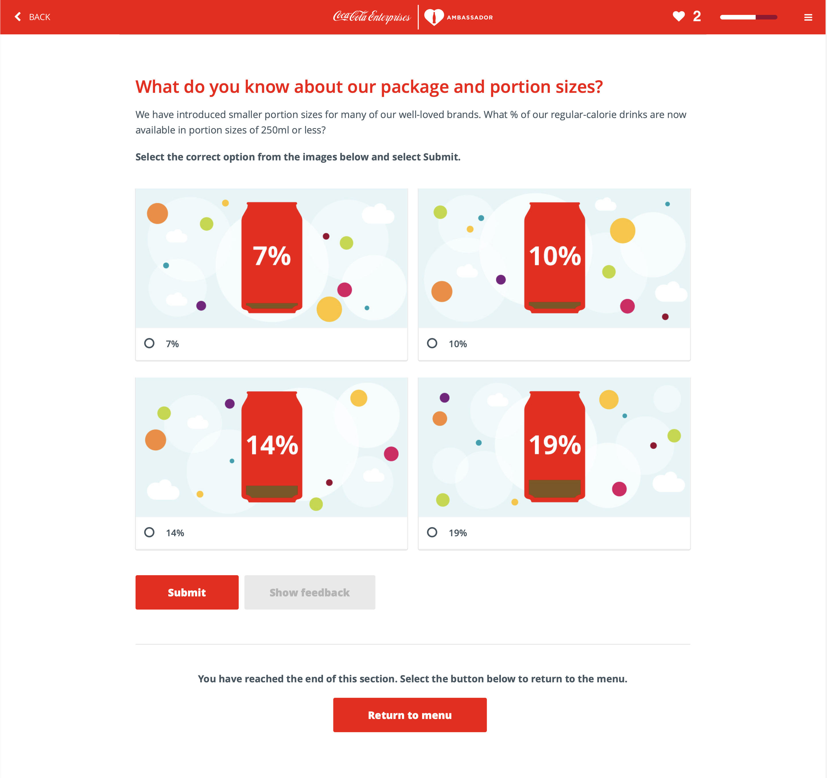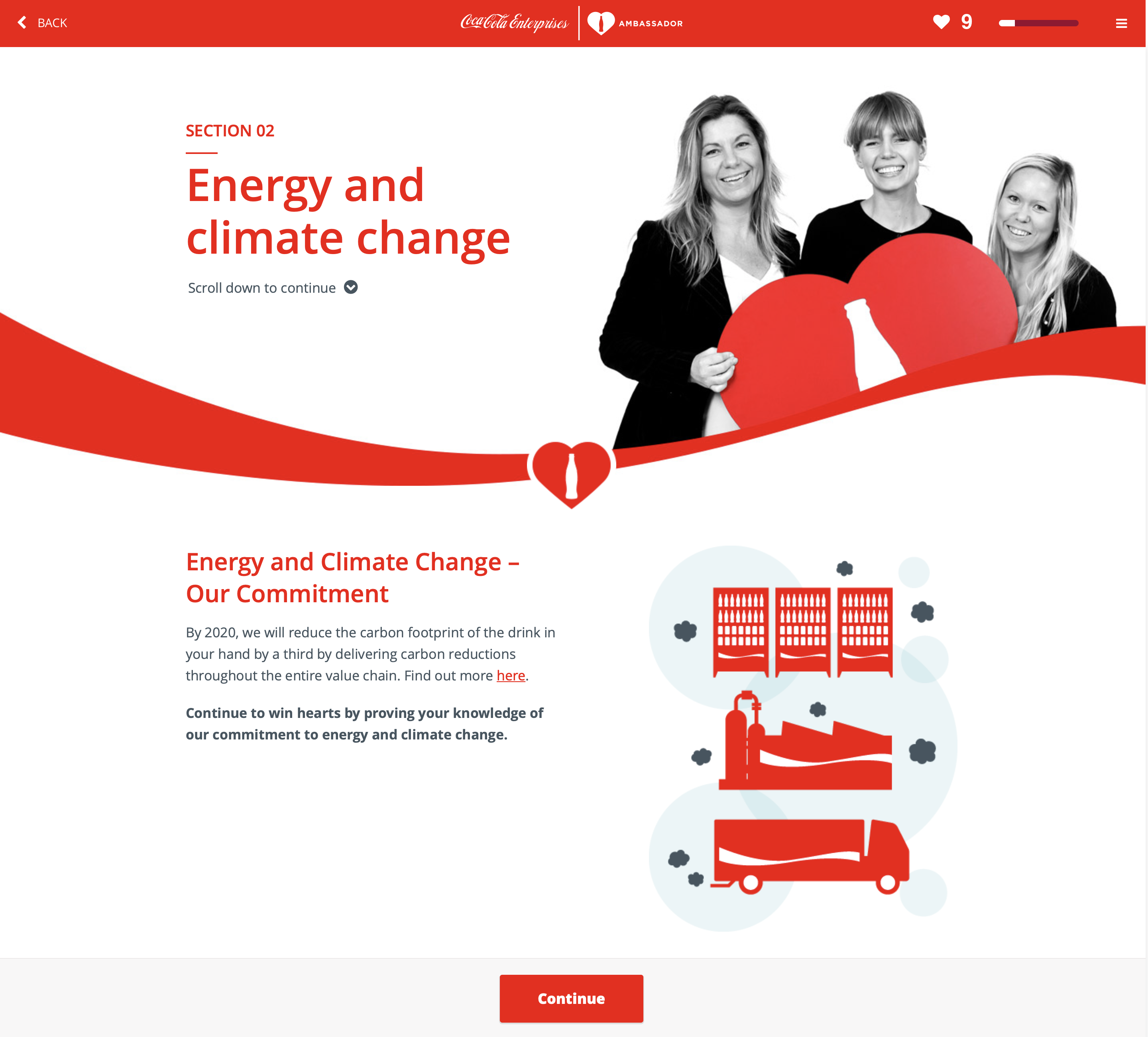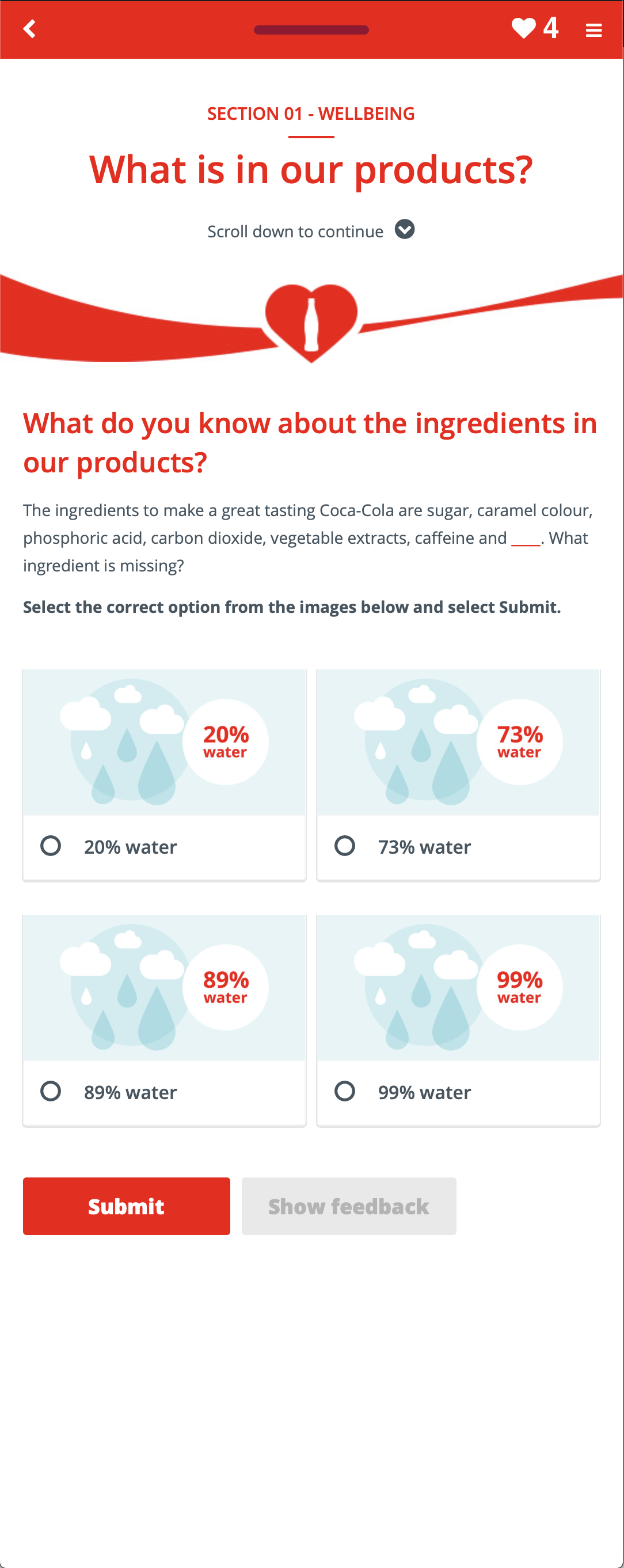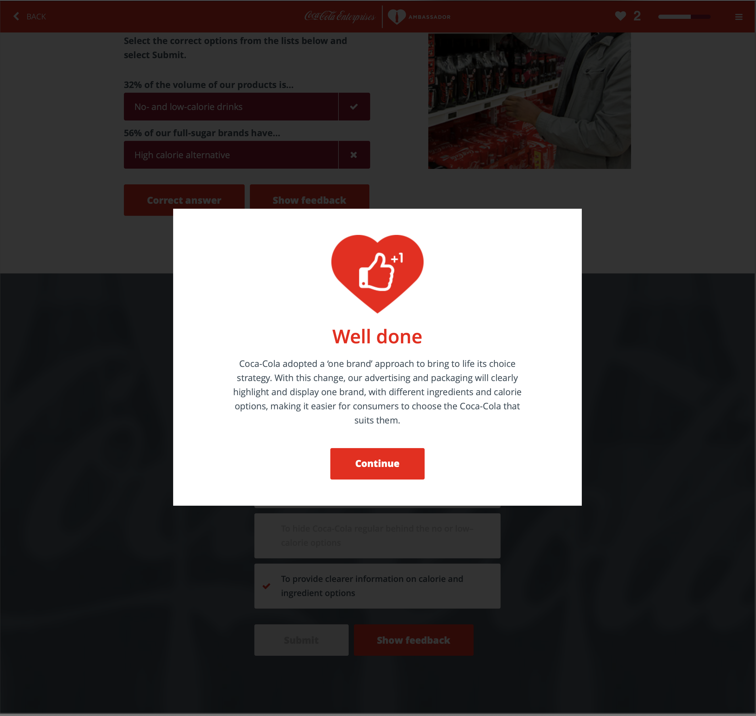 Using gamified learning scenarios to test brand knowledge – a mix of quiz-based techniques bring the facts to life through knowledge checks and scenario-based questions. These were carefully designed to replicate real-life situations that the Ambassadors might face. Combining facts and fun, it empowers and motivates them to learn the product knowledge they need to boost their confidence. Correct answers win hearts, with totals added to a European-wide leaderboard. Importantly, the number of hearts per country was converted into a donation to charity. The whole experience was developed using the Adapt authoring framework, making it easy for mobile workers to take part.