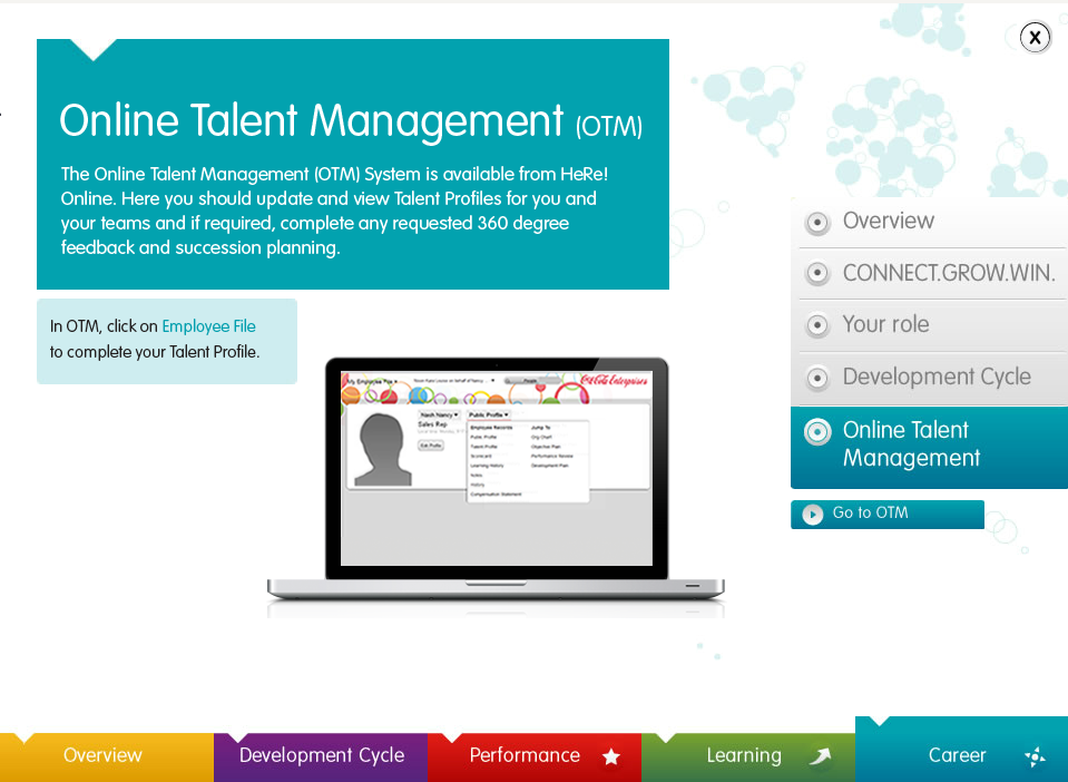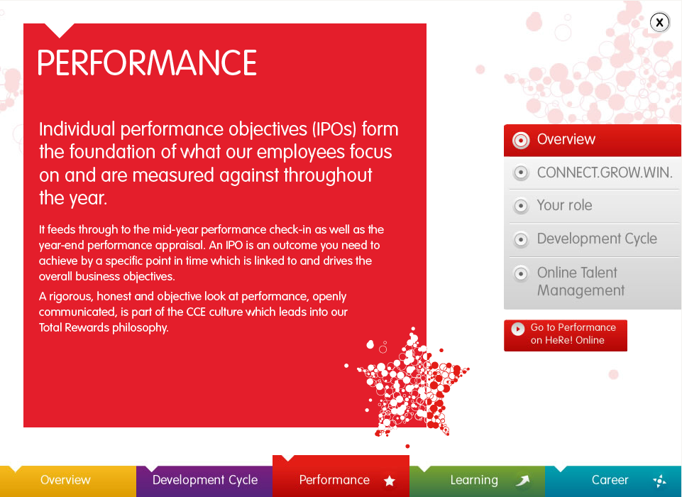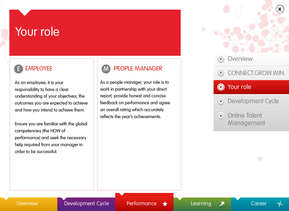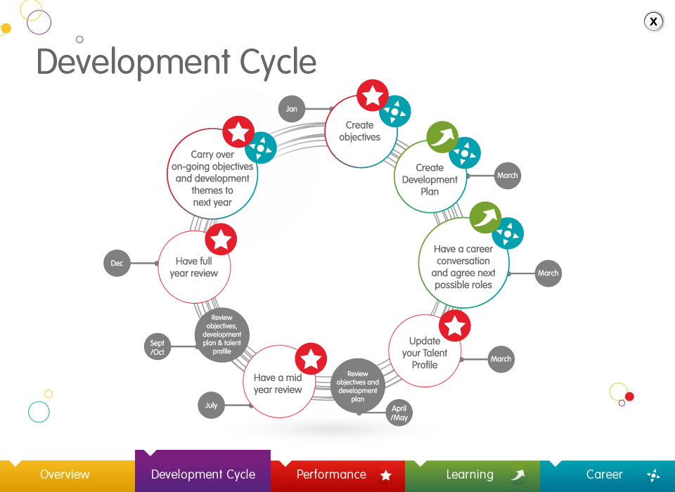This e-learning toolkit explains the development experience and links to tools and guides available to enhance performance, learning and career. Introducing the annual development cycle and covering topics such as objective setting, development plans, performance reviews and career conversations. Available in 5 languages. Created using Illustrator and Adobe Captivate.